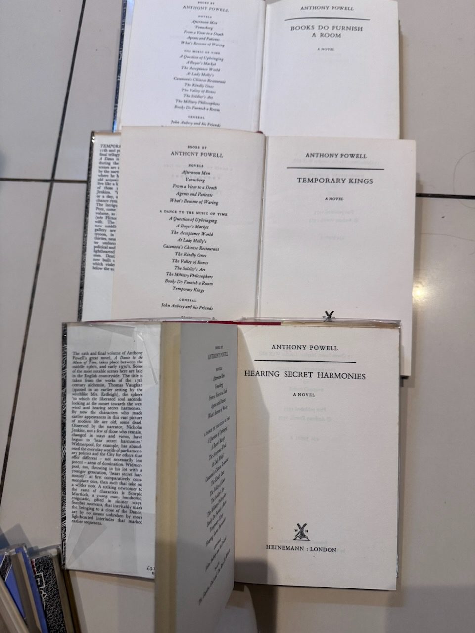 Anthony Powell’s brilliant twelve-novel sequence chronicles the lives of over three hundred characters, and is a unique evocation of life in twentieth-century England. It is unrivalled for its scope, its humour and the enormous pleasure it has given to generations. Anthony Powell’s A Dance to the Music of Time is an example of the roman fleuve, or “river novel” and is intended to be read as a unity. As such, it is often compared to Marcel Proust’s masterwork, A la recherche de temps perdu. Dance constitutes a sort of history of the twentieth century British life: it follows upper-middle class narrator Nicholas Jenkins and his contemporaries throughout a rapidly changing world from 1921 to 1971, with coverage weighed more heavily to the earlier years. All volumes have the James Broom-Lynne dust jackets 1. A Question Of Upbringing. 1951 [230pp] / 2. A Buyer’s Market. 1952 [274pp] / 3. The Acceptance World. 1955 [214pp] / 4. At Lady Molly’s. 1957. [239pp] / 5. Casanova’s Chinese Restaurant. 1960. [229pp] / 6. The Kindly Ones. 1962 [254pp] / 7. The Valley Of Bones. 1964 [243pp] / 8. The Soldier’s Art.1966 [228pp] / 9. The Military Philosophers. 1968 [244pp] / 10. Books Do Furnish A Room. 1971 [241pp] / 11. Temporary Kings. 1973 [280pp] / 12. Hearing Secret Harmonies, 1975 [272pp]
