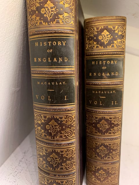 Macaulay’s History was originally published in 1848 in 5 volumes, but this edition reduced that to two, without a reduction in text. The History is famous for its brilliant ringing prose and for its confident, sometimes dogmatic, emphasis on a progressive model of British history. According to this view, England threw off superstition, autocracy and confusion to create a balanced constitution and a forward-looking culture combined with freedom of belief and expression. This model of human progress has been called the Whig interpretation of history.