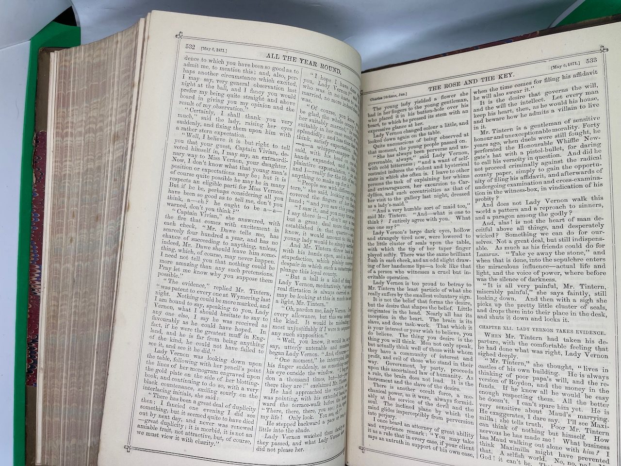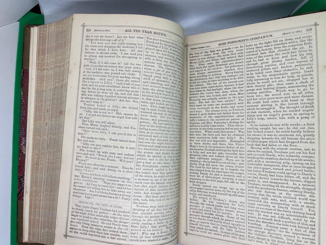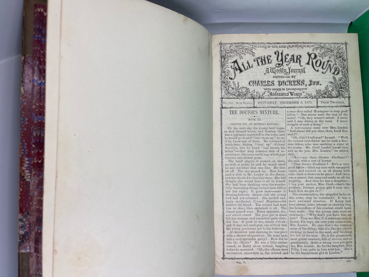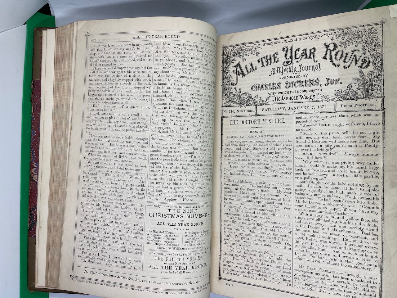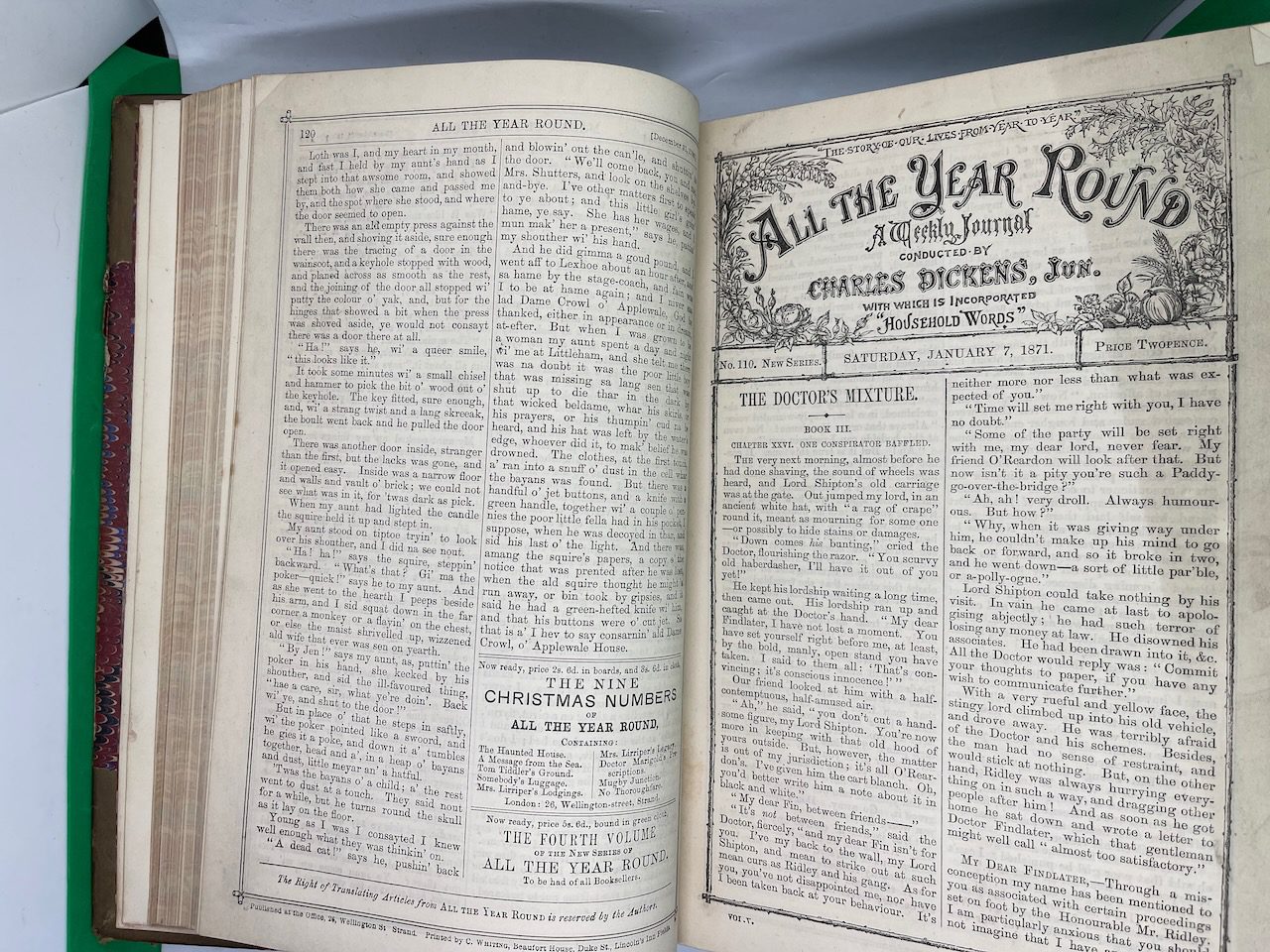 Charles Dickens started All The Year Round after a legal dispute with the publisher of his Household Words in 1859. It was in this weekly magazine that he first published A Tale of Two Cities. A week before he died in 1870, Dickens passed the editorship to his son, Charles Jr, and he would continue in this role for at least 20 years. This compilation was the first full year’s set after its founder died, covering Dec 1870 to May 1871.