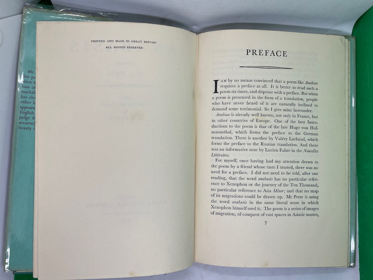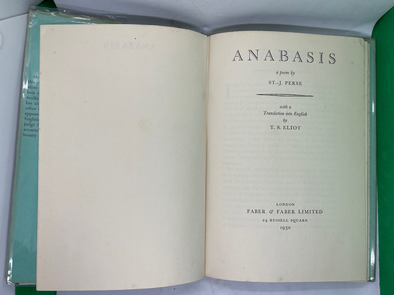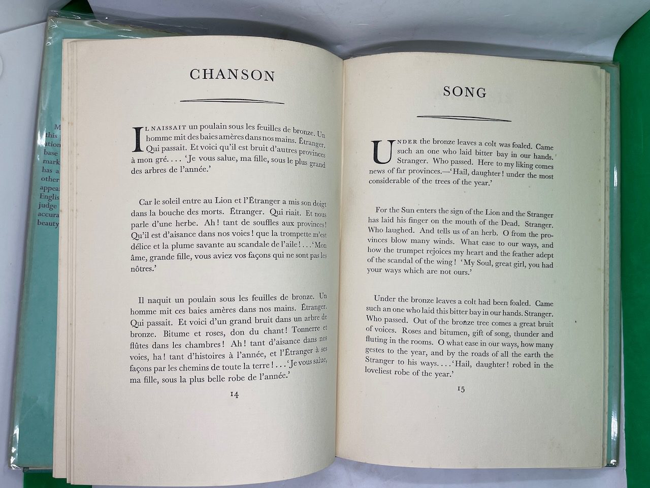 This internationally famous poem, considered to have exerted a wide influence on modern poetry, was first introduced to English-language readers in the translation by T.S. Eliot. In his Preface, Eliot describes it as “a series of images of migration” in the vast spaces of the ancient East and ranks it as “a piece of writing of the same importance as the later work of James Joyce.” This first edition includes both the French and English texts on facing pages as well as Eliot’s Preface.