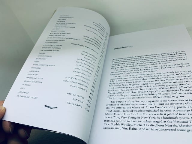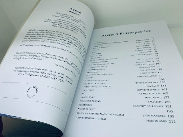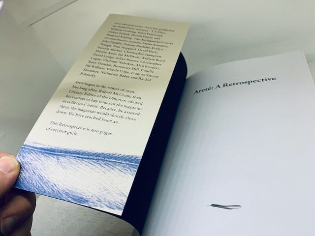 From flap: Over thirteen years, Areté has published six Nobel Prize winners: T S Eliot, William Golding, Boris Pasternak, Orhan Pamuk, Harold Pinter, and Rudyard Kipling. The distinguished roster of contributors includes Milan Kundera, John Updike, Salman Rushdie, Evelyn Waugh, Tom Stoppard, David Hare, Patrick Marber, Christopher Hampton, Martin Amis, Ian McEwan, William Boyd, David Lodge, Julian Barnes, Christopher Logue, Vladimir Nabokov, Alan Bennett, Rose Tremain, Rosemary Hill, Candia McWilliam, Wendy Cope, Frances Stonor Saunders, Nicholson Baker and Rachel Polonsky. Areté began in the winter of 1999. Not long after, Robert McCrum, then Literary Editor of the Observer, advised his readers to buy issues of the magazine as collectors items. Because, he assured them, the magazine would shortly close down. We have reached Issue 40. This Retrospective is 500 pages of survivor guilt.
