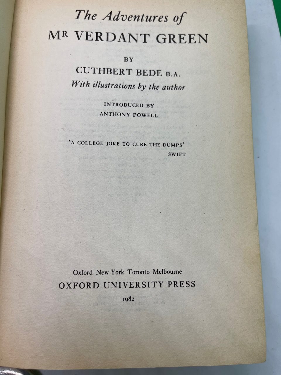 The Adventures of Mr. Verdant Green is a novel by Cuthbert M. Bede, a pseudonym of Edward Bradley (1827Ð1889). It covers the exploits of Mr Verdant Green a first year undergraduate at Oxford University. Different editions have varying titles, including Mr Verdant Green: Adventures of an Oxford Freshman. The same characters reappear in a sequel entitled Little Mr Bouncer and his friend Verdant Green. Introduction by the novelist Anthony Powell.