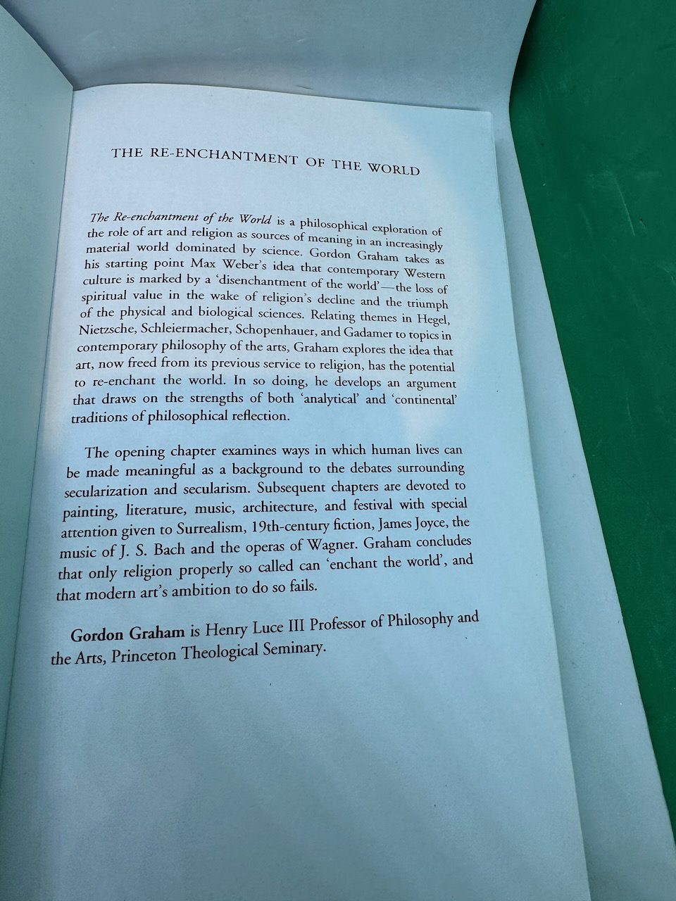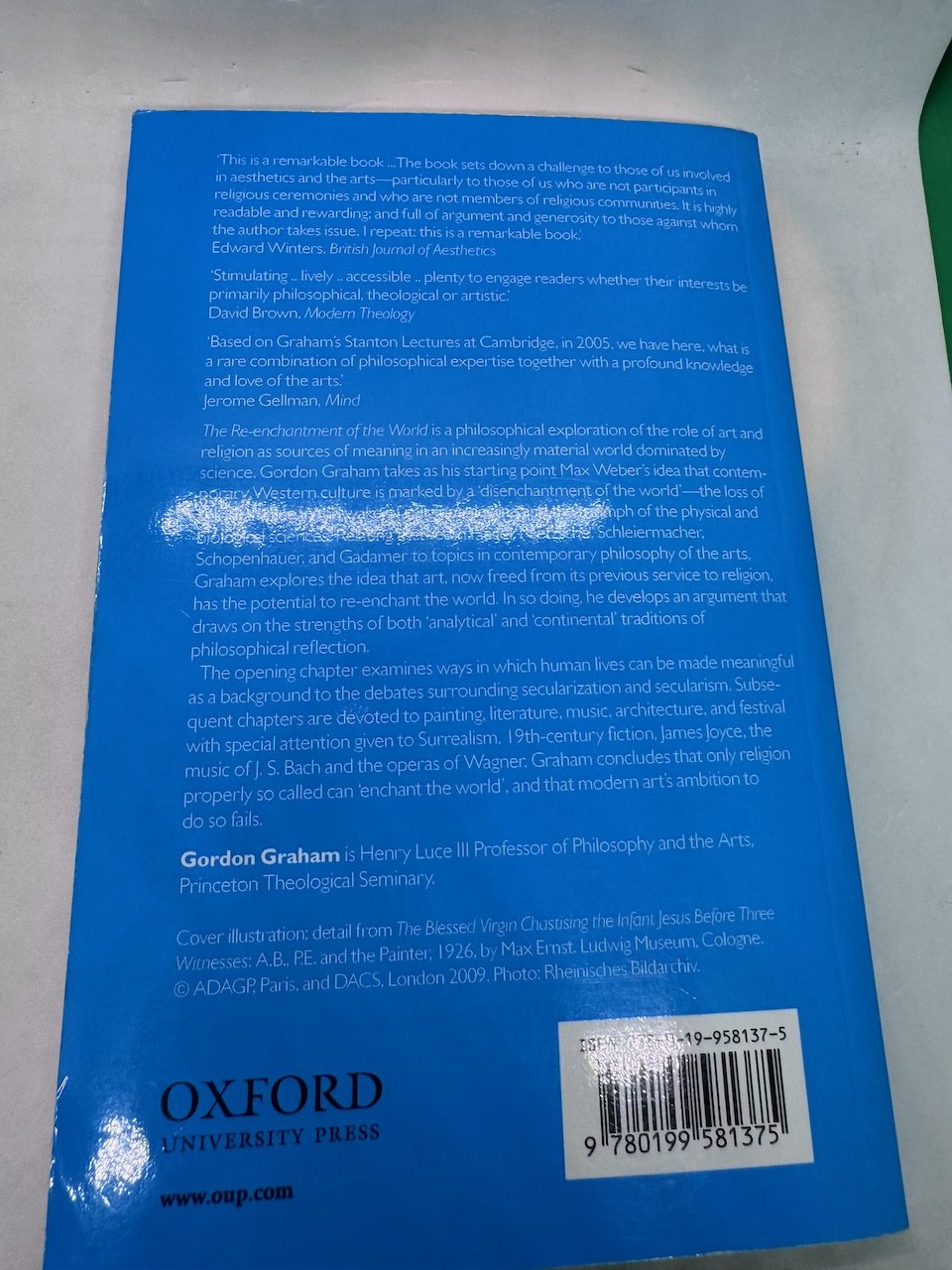 The Re-enchantment of the World is a philosophical exploration of the role of art and religion as sources of meaning in an increasingly material world dominated by science. Gordon Graham takes as his starting point Max Weber’s idea that contemporary Western culture is marked by a ‘disenchantment of the world’ — the loss of spiritual value in the wake of religion’s decline and the triumph of the physical and biological sciences. Relating themes in Hegel, Nietzsche, Schleiermacher, Schopenhauer, and Gadamer to topics in contemporary philosophy of the arts, Graham explores the idea that art, now freed from its previous service to religion, has the potential to re-enchant the world. In so doing, he develops an argument that draws on the strengths of both ‘analytical’ and ‘continental’ traditions of philosophical reflection. The opening chapter examines ways in which human lives can be made meaningful as a background to the debates surrounding secularization and secularism. Subsequent chapters are devoted to painting, literature, music, architecture, and festival with special attention given to Surrealism, 19th-century fiction, James Joyce, the music of J. S. Bach and the operas of Wagner. Graham concludes that that only religion properly so called can ‘enchant the world’, and that modern art’s ambition to do so fails.