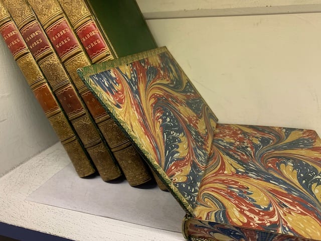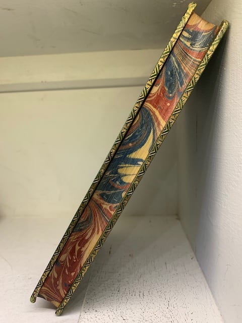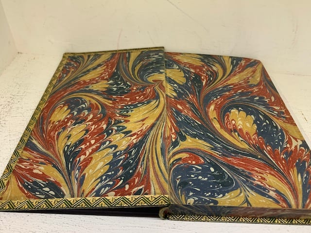 Very good, Full green glt ruled morocco leather with spines turning to brown; (vol II front board hinge largely cracked).